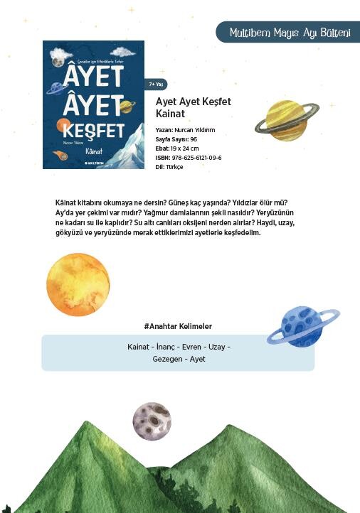 Kâinat kitabını okumaya ne dersin? Güneş kaç yaşında? Yıldızlar ölür mü? Ay’da yer çekimi var mıdır? Yağmur damlalarının şekli nasıldır? Yeryüzünün ne kadarı su ile kaplıdır? Su altı canlıları oksijeni nerden alırlar? Haydi, uzay, gökyüzü ve yeryüzünde merak ettiklerimizi ayetlerle keşfedelim.
