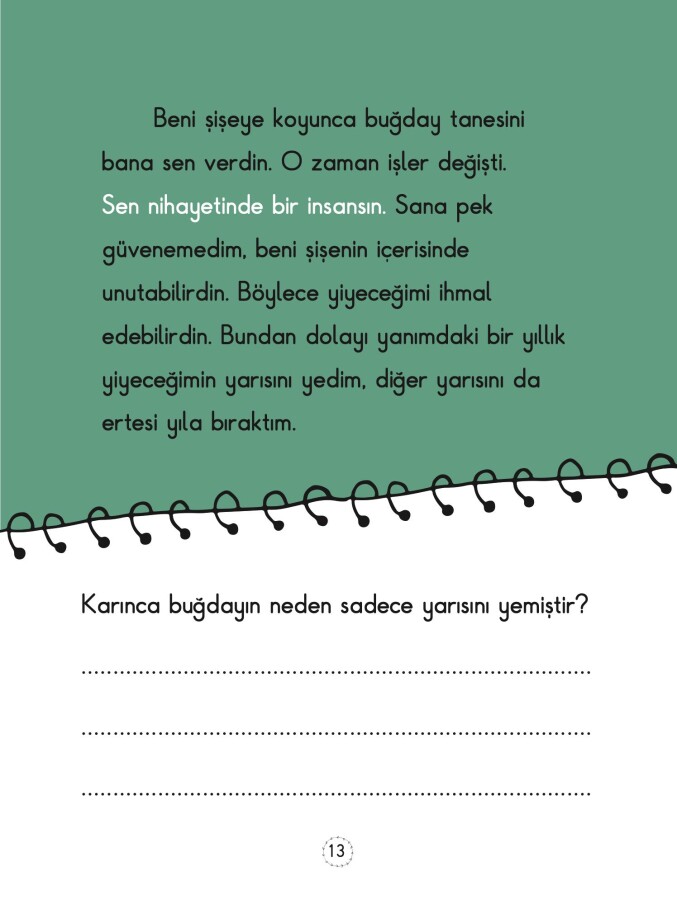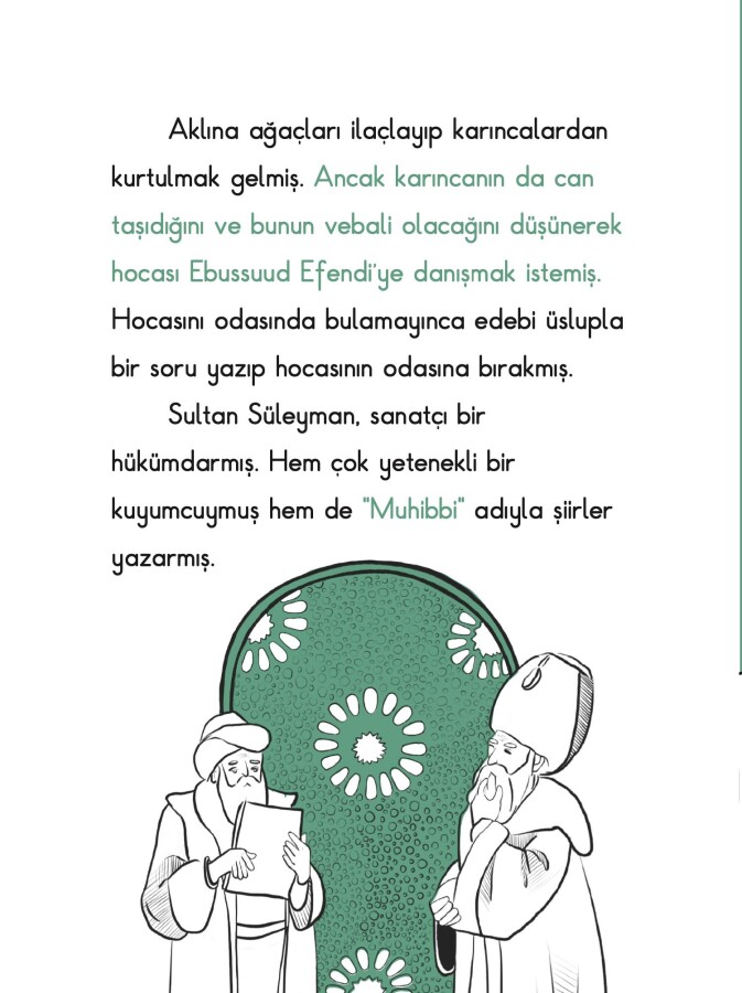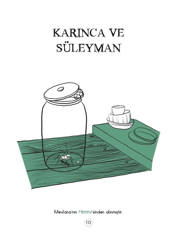 Mevlana’nın Mesnevi’sinde yer alan “Sivrisinek ile Süleyman” , “Karınca ve Süleyman”, “Karınca Vadisi”, “Karınca ile Kanuni Sultan Süleyman” ve “Karınca ile Kalem” masallarının anlatıldığı bu kitap; çocuklara ilk okuma dönemlerinde hem okumayı hem de kültürel değerlerimizi sevdirecek.