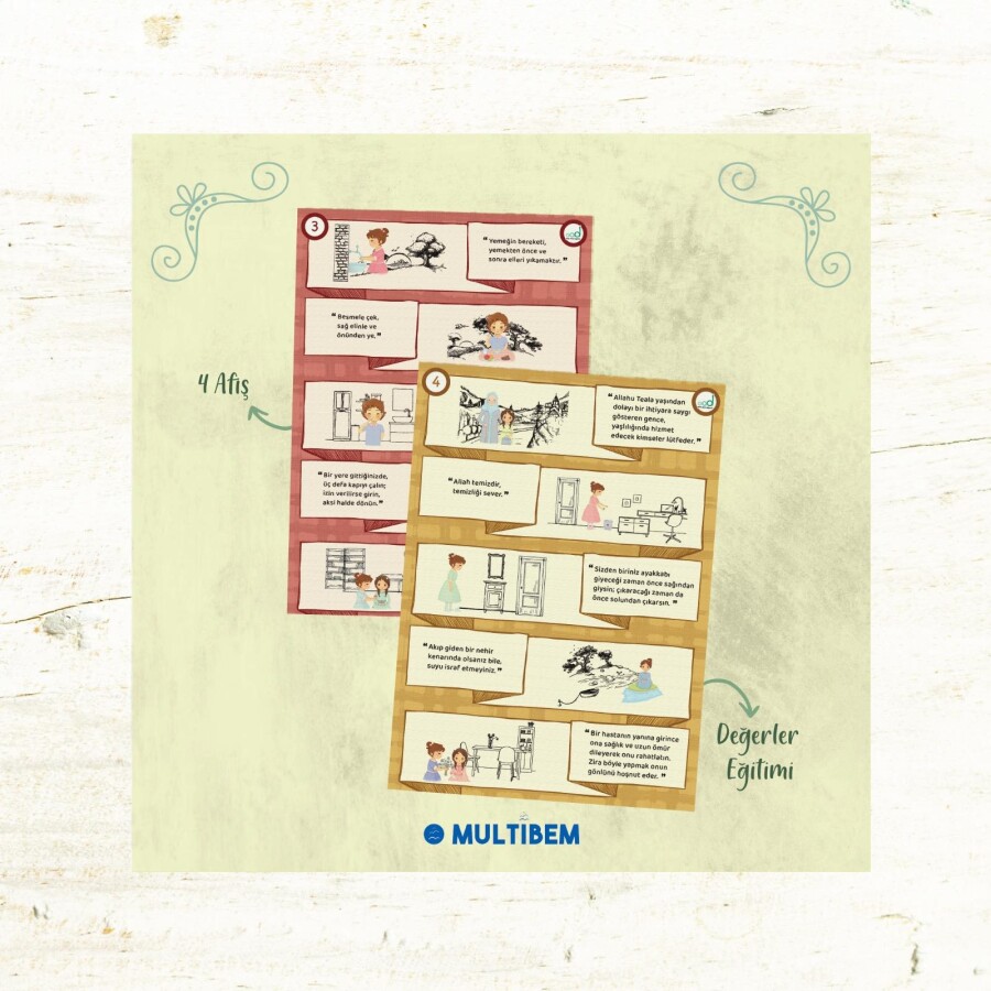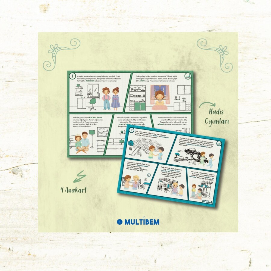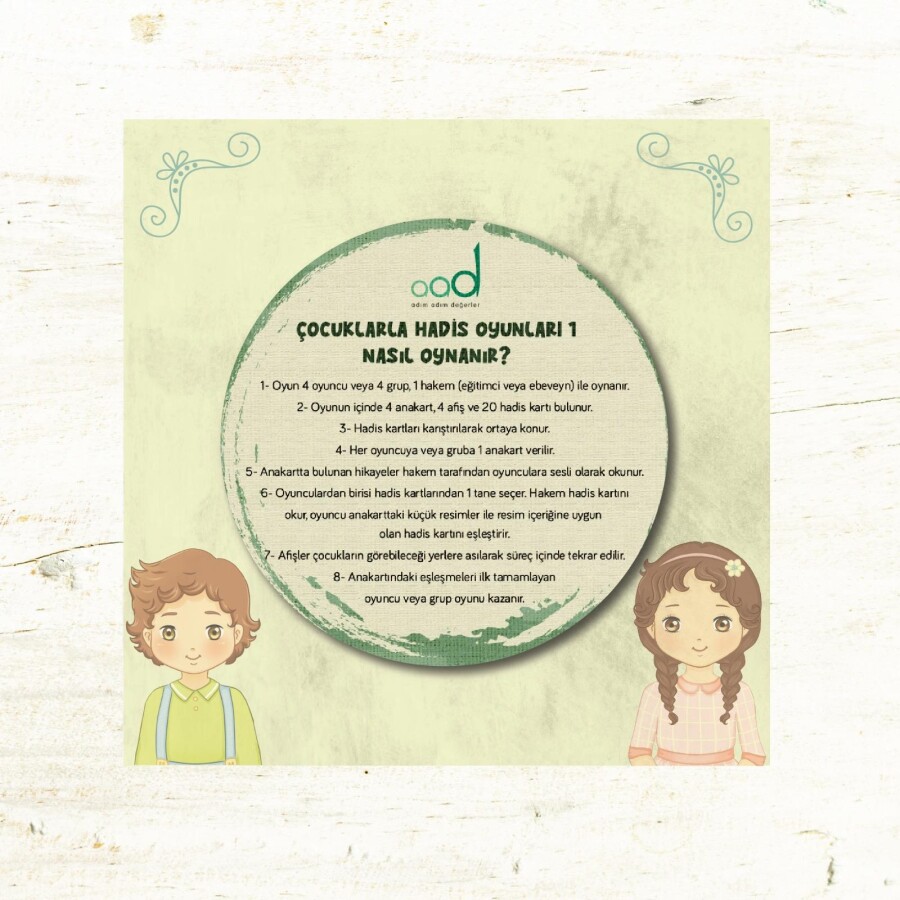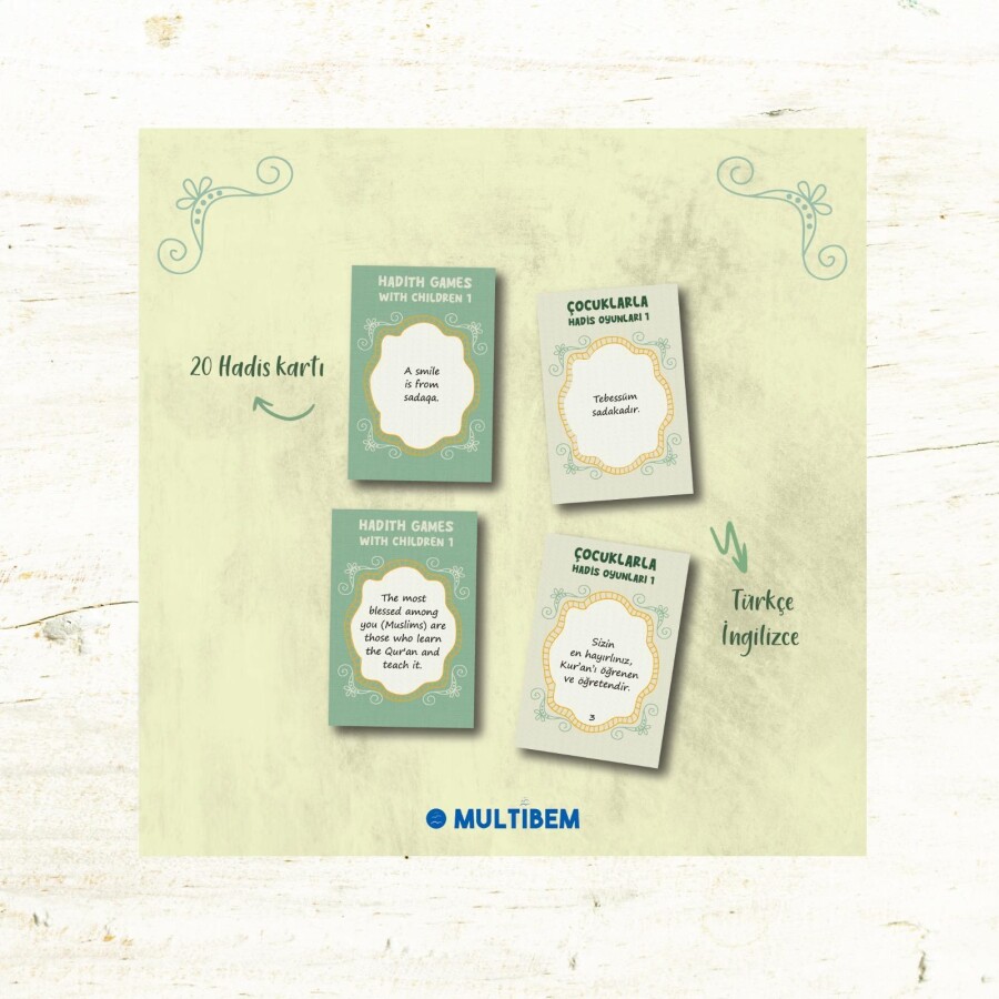 Çocuklar aile bireyleri ve arkadaşlarıyla bu oyunu zevkle oynarken kolaylıkla 20 hadisi ezberleyecektir. Kartların her biri İngilizce ve Türkçe olarak hazırlanmıştır.