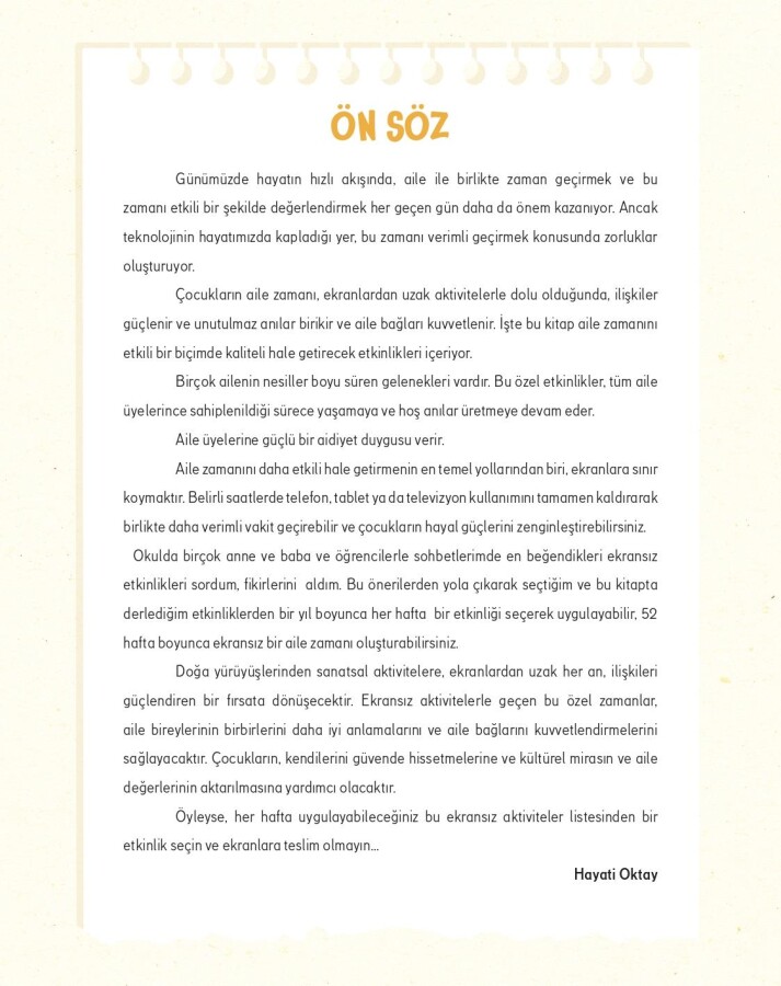 Her yaştan çocuğa hitap eden bu eser, çocuklarıyla nitelikli zaman geçirmek isteyen ebeveynler ve eğitimciler için yol gösterici bir rehber niteliğindedir. Evde, okulda ve açık alanlarda rahatlıkla uygulanabilir içerikler sunar.