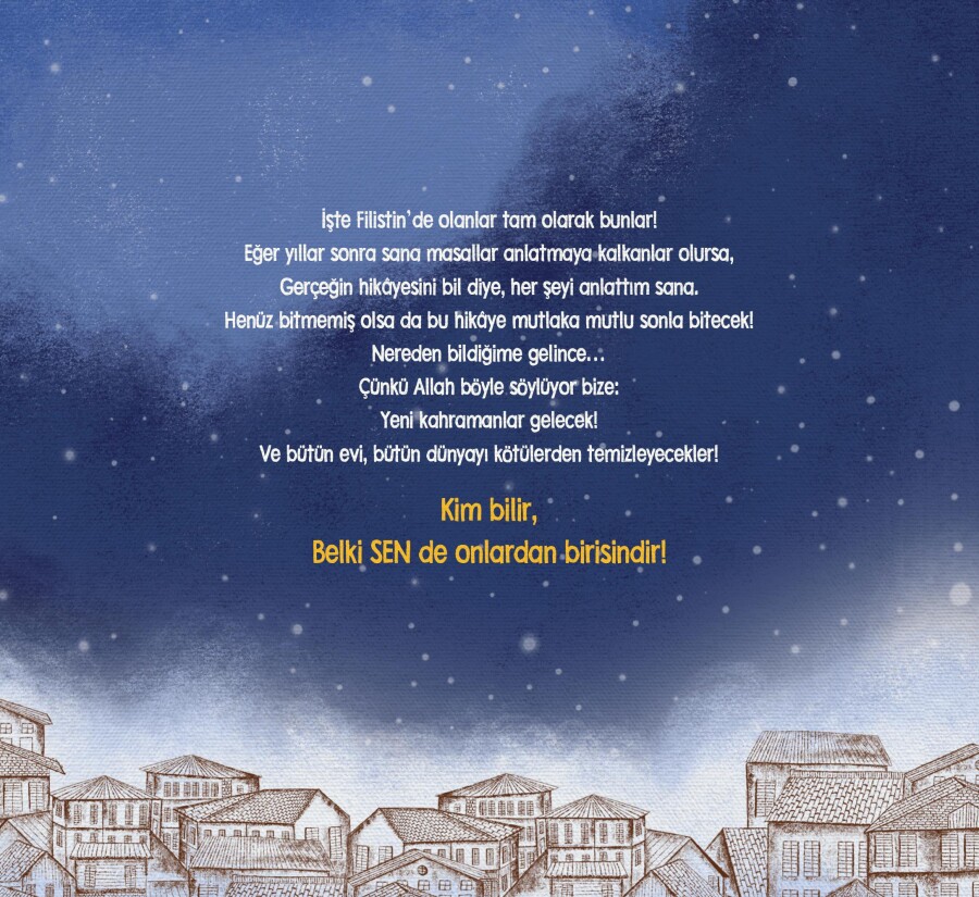 Tüm geliri Filistin yararına kullanılmak üzere hazırlanmış bir sosyal sorumluluk projesidir. Sınırlı sayıda üretilen; yayınevinin, yazarın ve tüm çizerlerin gönüllülükle dahil olduğu bu kitapta emeği geçen herkese teşekkür ederiz.
