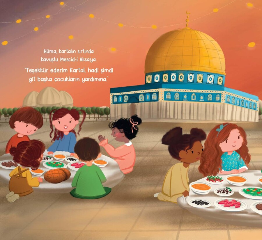İftara çok az zaman kalmıştı. Hüma’nın kanatları olsa Mescid-i Aksa’ya uçabilirdi. Aniden bir kartyal çıkageldi. Hüma sordu na “Uçarak götürür müsün beni Mescid-i Aksa’ya?”