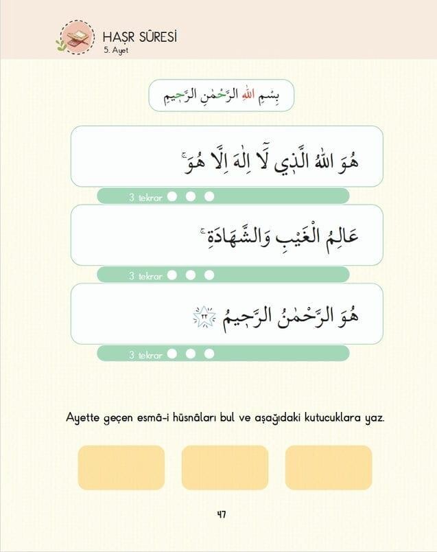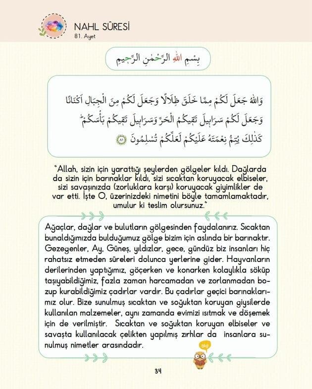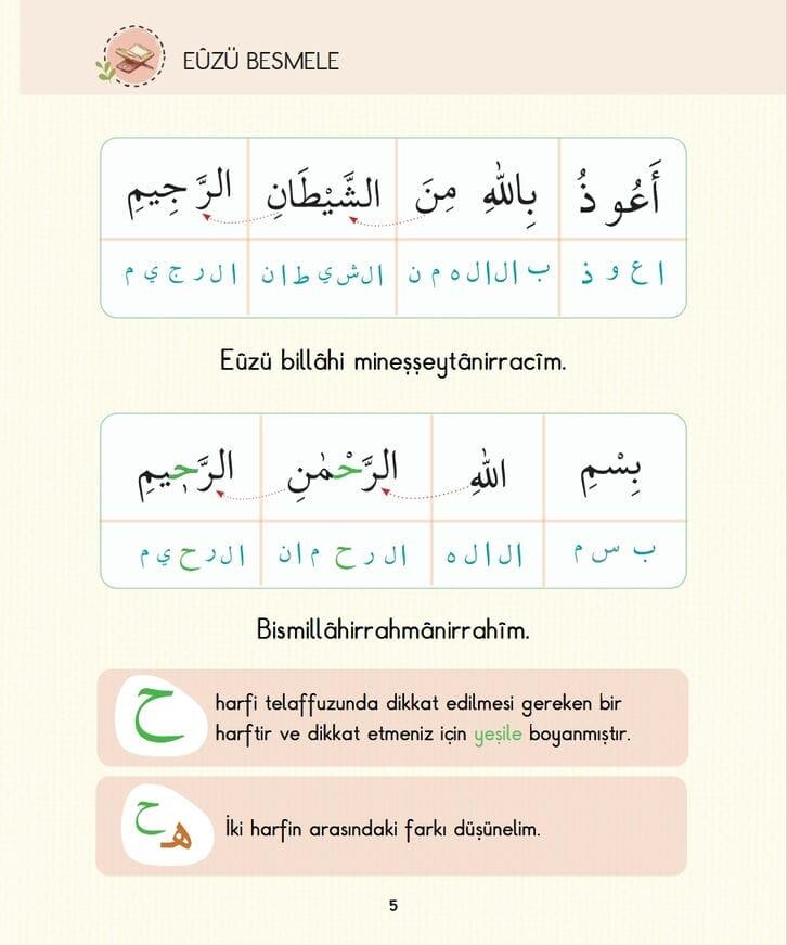 Namaz eğitimine destek olmak amacıyla, temel sûrelerin ezberlerine yer verilen kitap, çocukların yaş düzeyine uygun etkinliklerle ve oyunlarla zenginleştirilmiştir. Tecvit kuralları renkli işaretlerle gösterilmiş, harf cetvelleriyle harf tanıma ve ayırt etme, harf bulma becerileri desteklenmiştir.