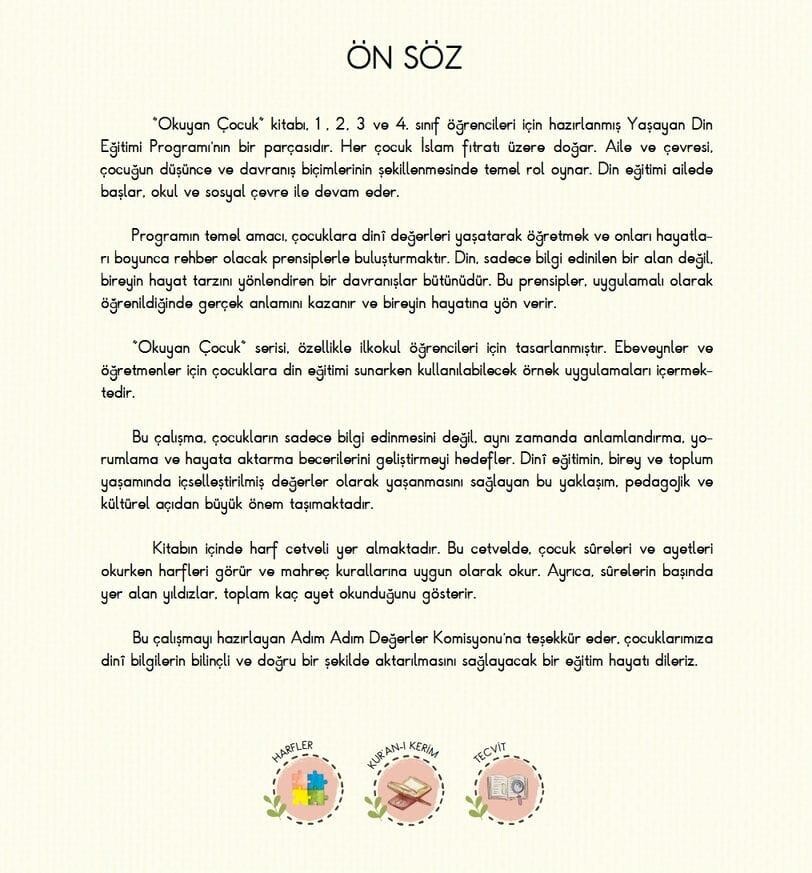 Çocukların fıtratına uygun olarak şekillenen din eğitimi, hayatın doğal bir parçasıdır. Okuyan Çocuk kitabı, bu anlayışla hazırlanmıştır. Kur’ân-ı Kerîm’i doğru telaffuzla ve kuralına uygun şekilde okumayı öğretmeyi amaçlayan özel bir kaynaktır. Her kitap 52 sayfadan oluşmaktadır.