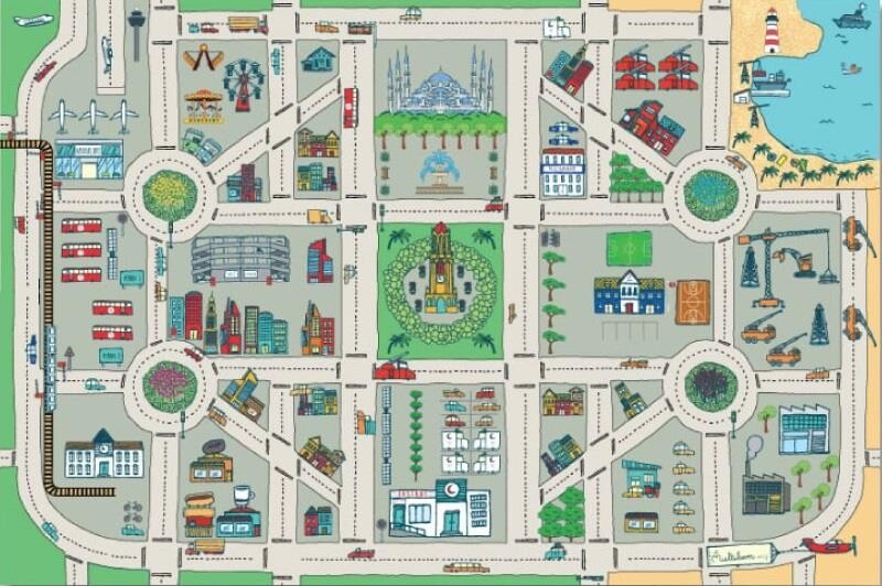 Hastanesinden camisine, havalimanlarından okullara kadar her şey bu özel halı üzerinde! Çocuklarınız, bu detaylı harita üzerinde oyun arabalarını sürebilecekleri yolları keşfederken, farklı bölgelerde de yaratıcı oyunlar oynayabilecekler.