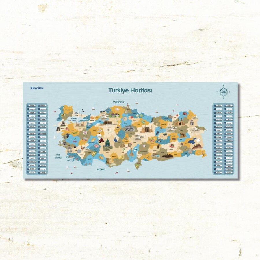 şadıkları ülkeyi, tarihi dokusunu, yöresel ve kültürel özelliklerini görsel olarak somutlaştırmaları hedeflenir. Çocuklar bu harita ile yaşadıkları ülkenin bölgelerini, şehirlerini, il kodlarını, tanımış olacaklardır. Bu harita onlara aynı zamanda yaşadıkları ülkede yalnız olmadıklarını, büyük bir topluluğun parçası olduklarını gösterecektir.Ebat: 200 x 90 cm